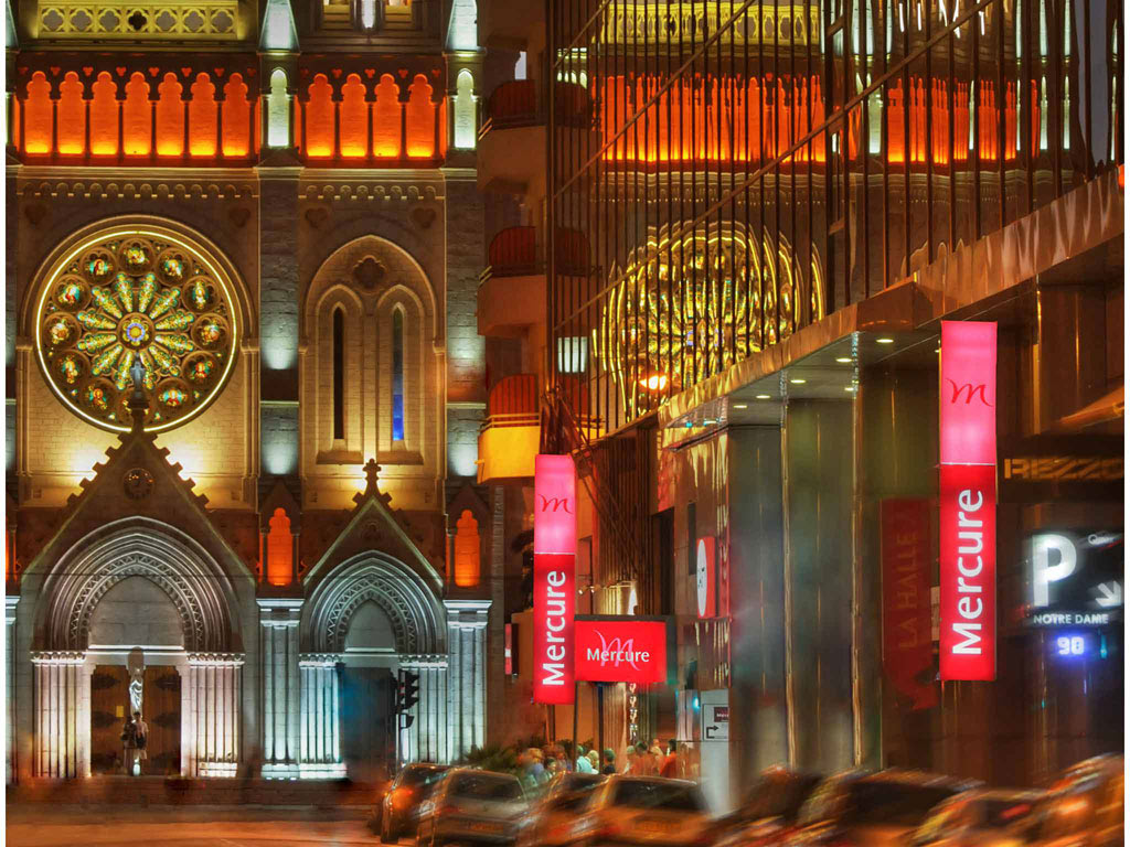 The recently renovated 4-star hotel Mercure Nice Centre Notre Dame hotel is located opposite the Notre Dame church, near to Place Masséna, the Promenade des Anglais and the old town. The hotel is 328 yards (300 m) from the train station and 4.3 miles (7 km) from the airport. 198 rooms are available and there is a 21,528 sq. ft. (2000 m²) indoor garden for you to enjoy. There is also a swimming pool and a rooftop bar with panoramic views over the city. Paying indoor public car park.