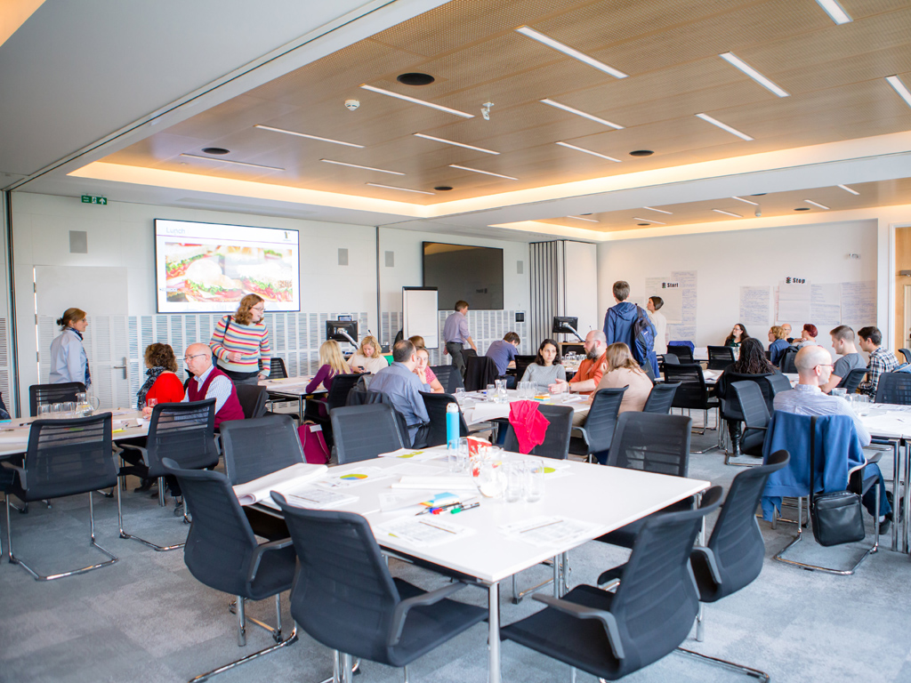 Either side of the Oak Suite are a pair of smart boardrooms: The Maple Boardroom and The Tulip Boardroom. Each hosts up to 10 delegates and works well as breakout spaces throughout the day, with neutral decor, one large, fixed table and a screen for presentations.