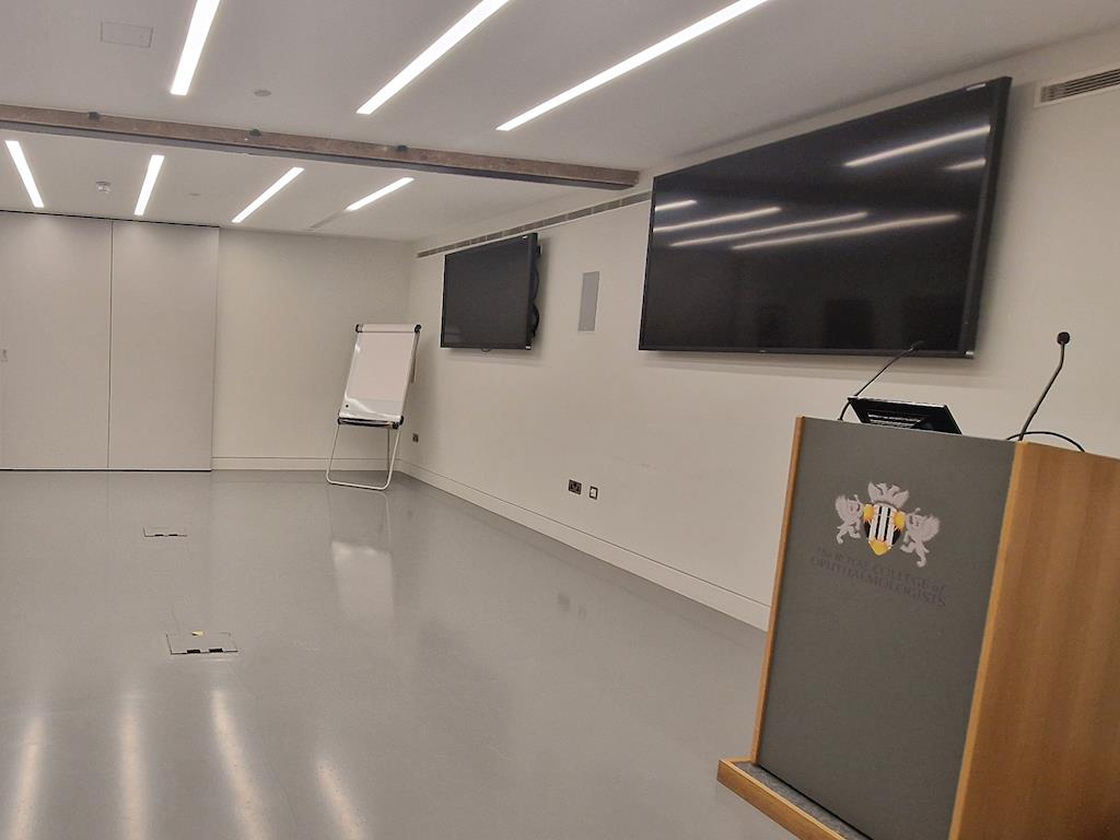 In theatre style, this space can accommodate up to 60 delegates. There are 3 HD LED screens – one 80” and two 65” – which can display a host of inputs, including HDMI/VGA/Blu-ray/Freeview/Crestron air media. There is also a Cisco HD camera allowing video/audio recording should you require this facility. You will be provided with MP4 format files to do with as you wish.