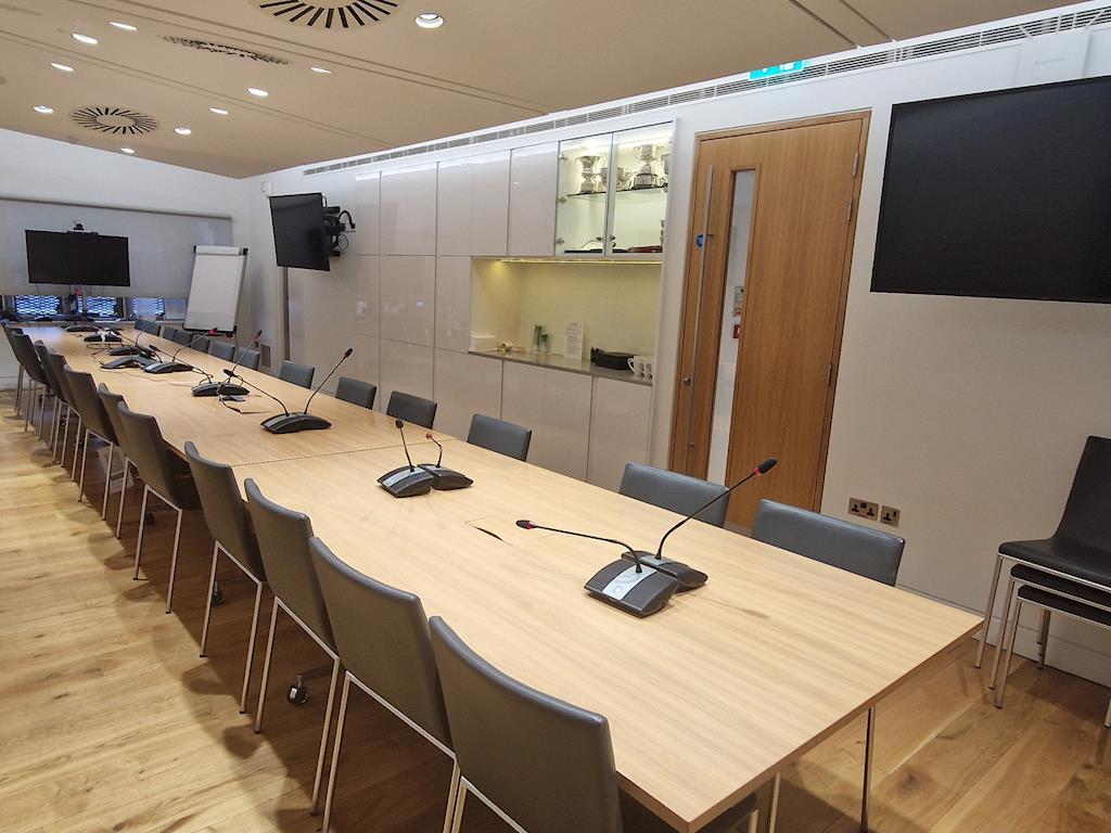 The council room has a capacity of up to 40 people in boardroom style. It features four strategically placed 55” LED screens for maximum viewing capabilities. It has inputs for HDMI/VGA/Freeview/Crestron air media and also boasts a Sennheiser microphone system. The microphones are also integrated with the Cisco Video Conferencing system.