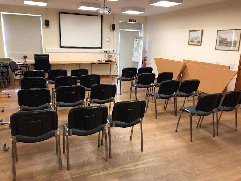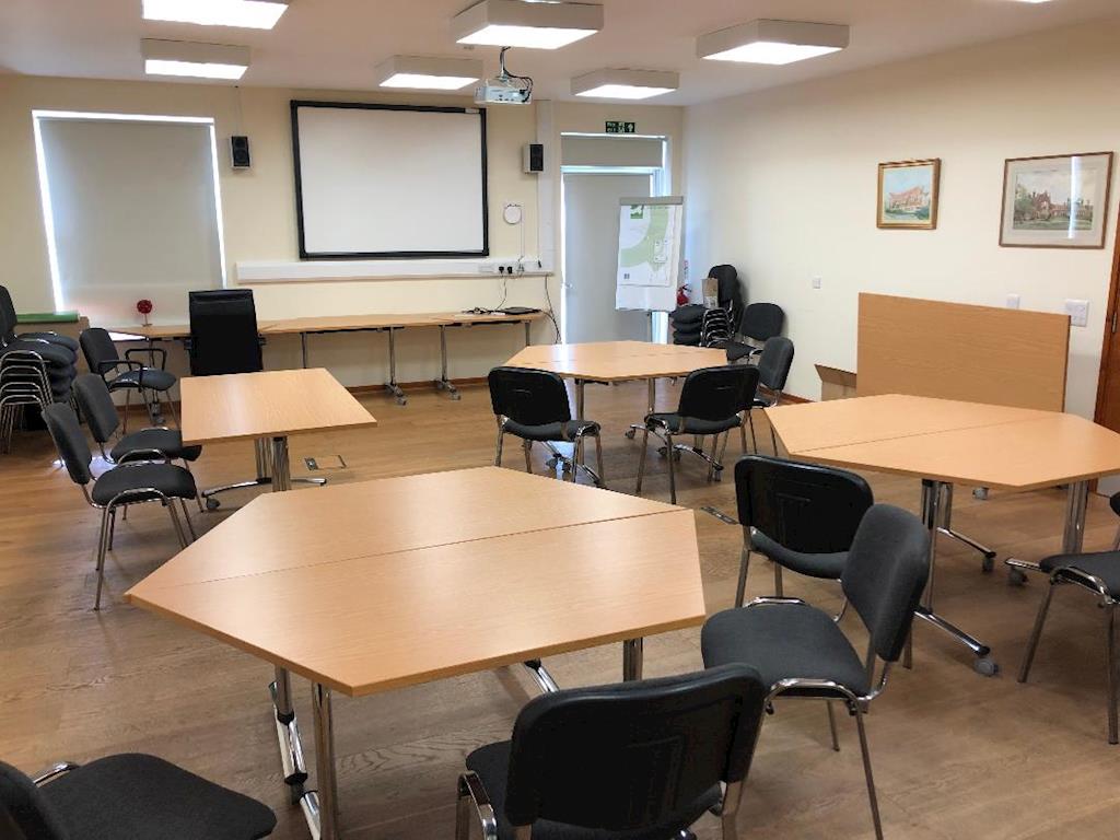 Fully equipped training annexe/ meeting room for hire in stunning tranquil location. Seats up to 25 people around tables, up to 40 in rows.